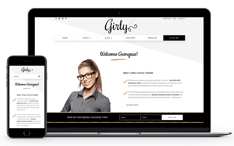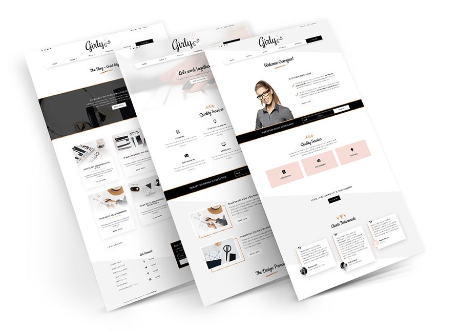 The Girly child theme is a beautifully crafted theme, designed with meticulous attention to detail. It has been created for female entrepreneurs looking for a ready-made solution for a gorgeous professional website. Whether you are a consultant, a coach, a writer, an artist, a designer or a blogger – with the Girly child theme you’ll get your business to the next level.