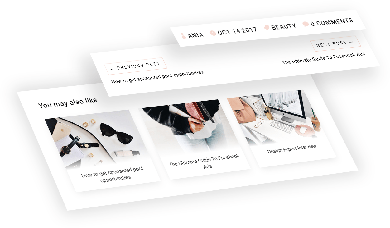 Girly is perfect for bloggers – every single blog post has additional features like automatic Previous/Next post links with titles and the “You may also like” section with random related posts from the same category. It’s designed to keep your readers on your site as long as possible as they read through all your content.