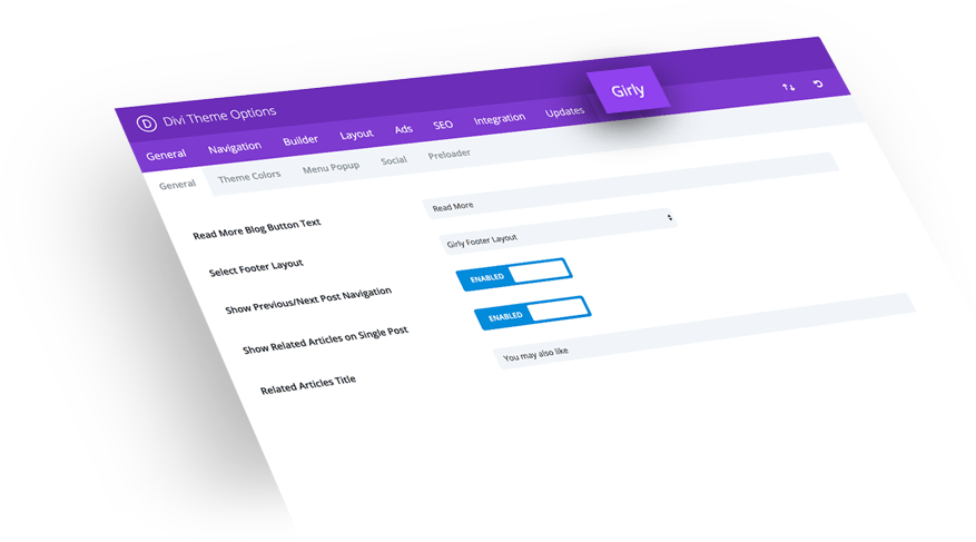 Girly features impressive customization possibilities available right in the Divi Theme Options. You can set any layout from the Divi Library and display it as a global footer. You can choose custom 404 error page layout or a pop-up layout. You can freely edit the theme colors, add more links to your social profiles, and customize the preloader settings.